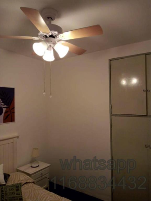 1 dormitorio: cama matrimonial con colchón de resortes, placard y ventilador de techo.