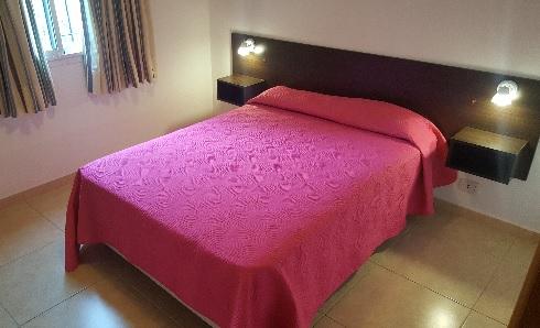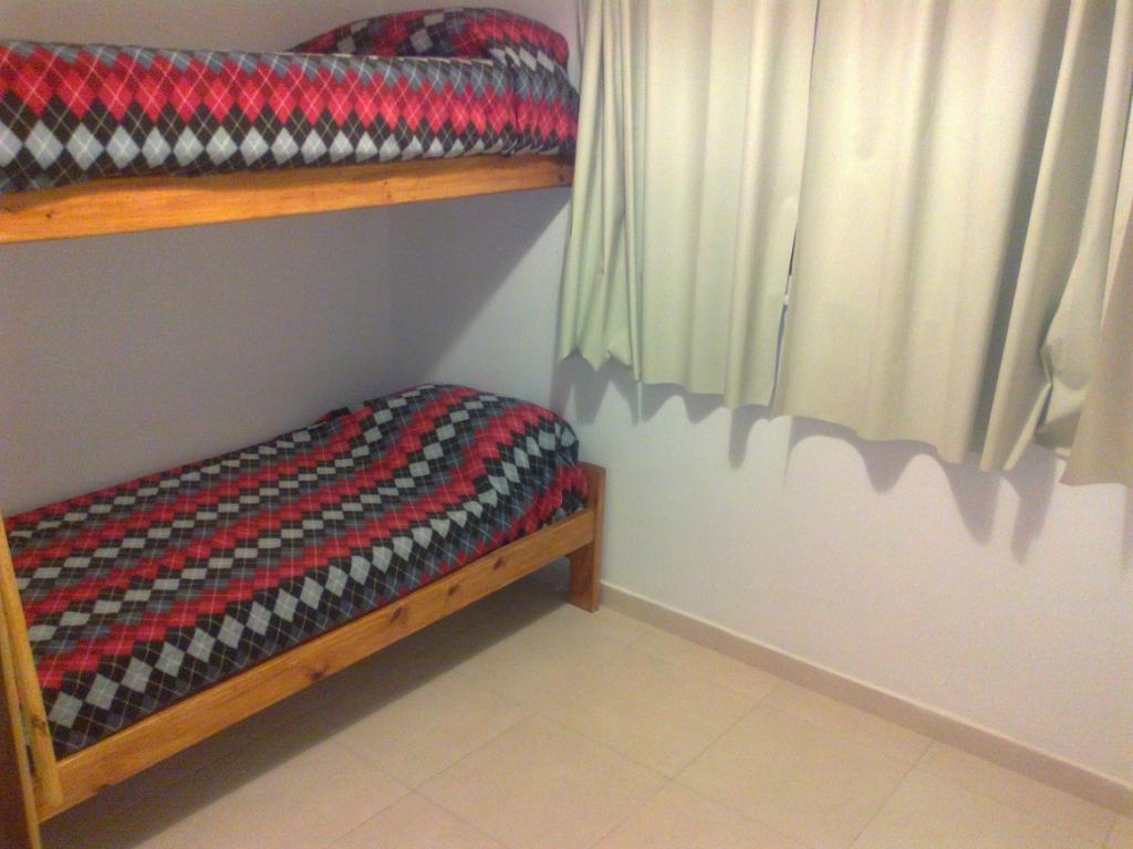 Dos dormitorios,(uno con cama 2 plazas y otro con 2 camas) y en el living hay un sofá cama con otra cama carrito que sale de abajo.